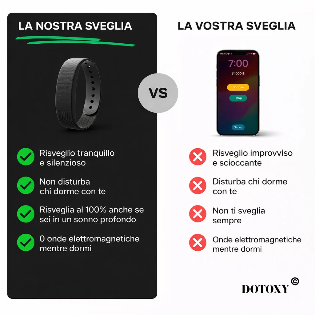 Il tuo smartphone sta distruggendo il tuo sonno. Notifiche, luce blu, la tentazione di controllare i social... tutto questo sabota il tuo riposo. DOTOXY ti libera: niente telefono sul comodino, solo un risveglio naturale. I nostri clienti dormono in media 47 minuti in più a notte. Il tuo corpo ti ringrazierà.